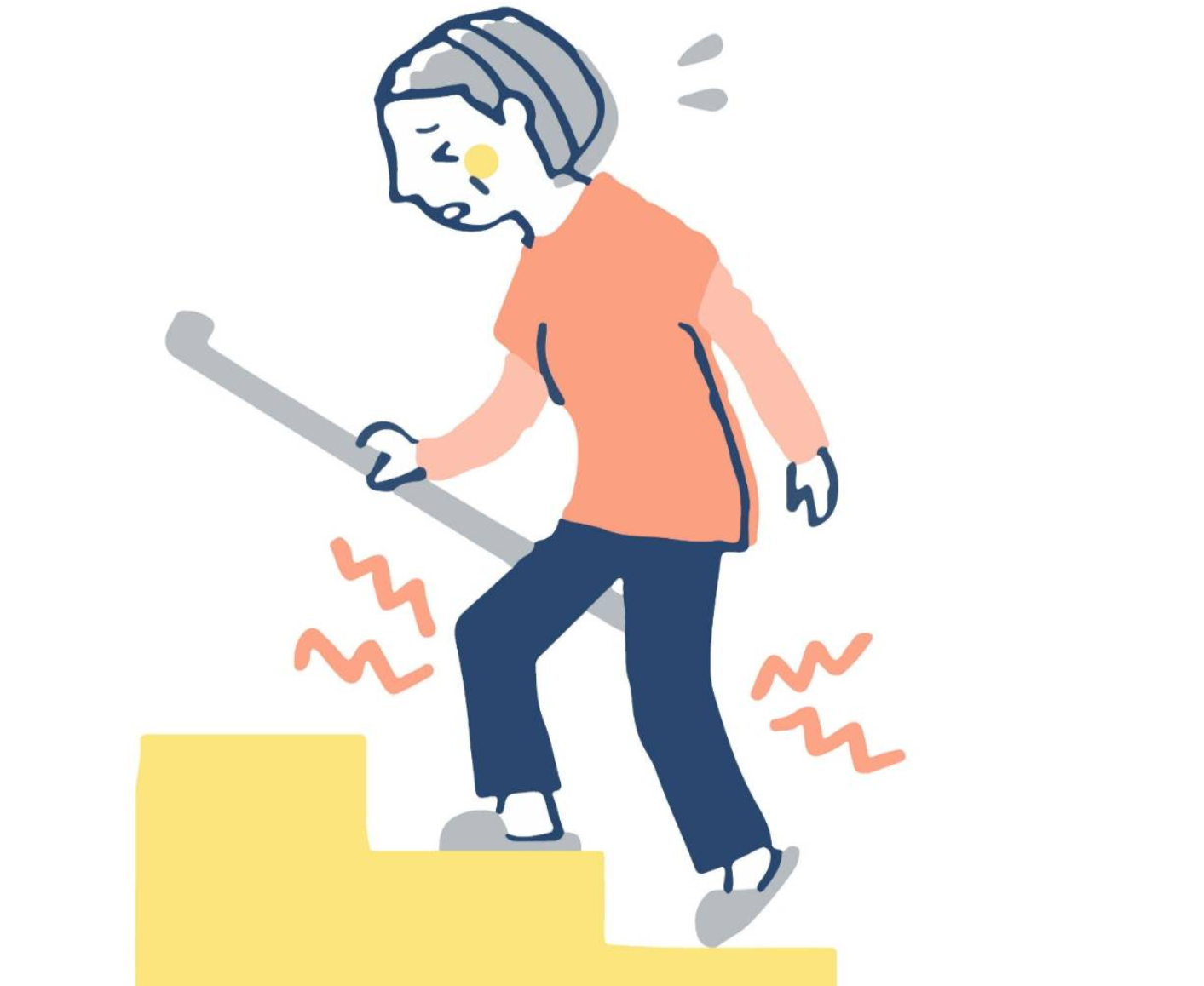 5年前に発症。一度治ったが直近1年痛みがぶり返す。階段を降りる時に力が抜けてしまい転倒の恐れがあるとのこと。