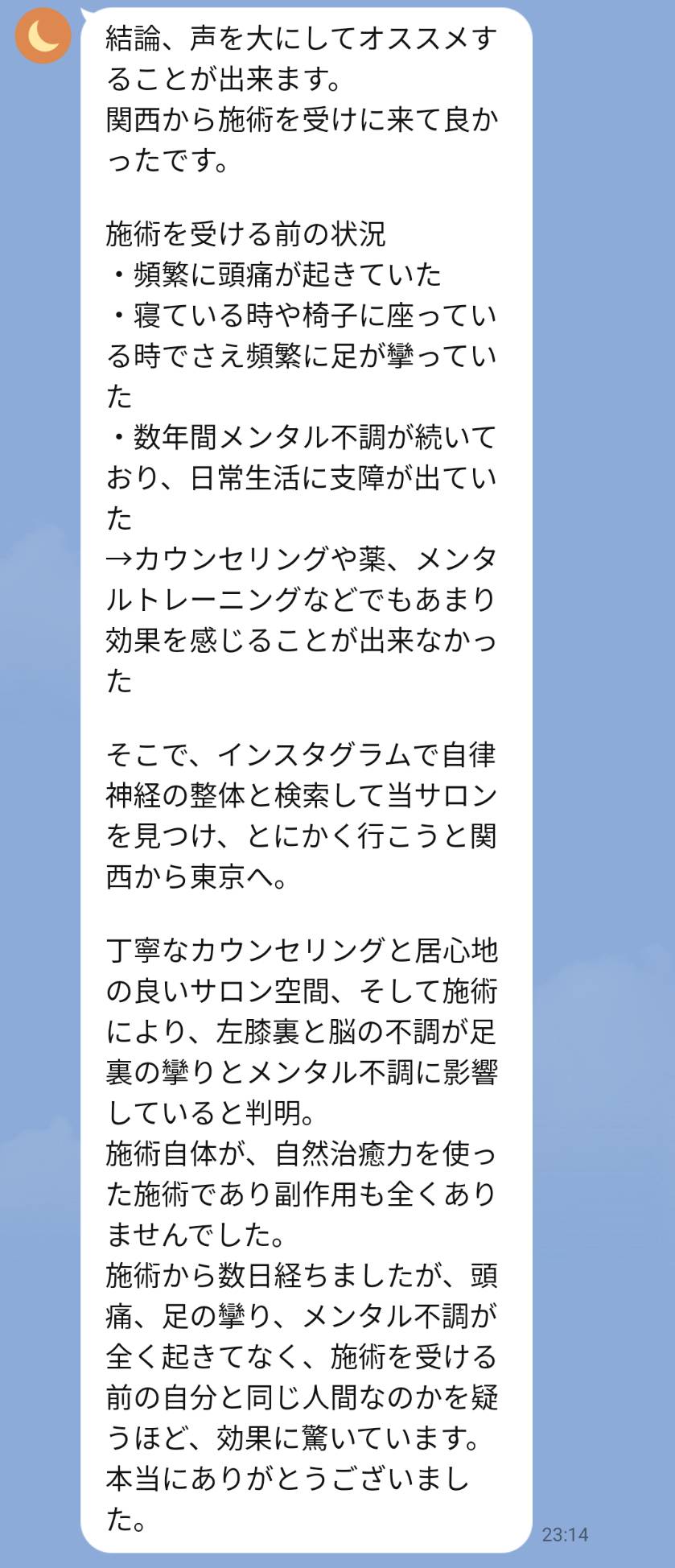 電車の中や大人数の中などで、まわりの人が気になってしまい疲れたり、呼吸がしづらくなったり、1人になりたくなったりしていたが、施術後は一切なくなったとのこと!