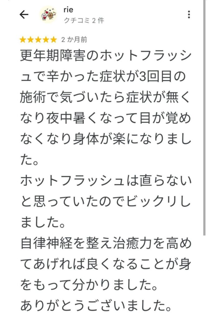 更年期障害のホットフラッシュで辛かった症状が3回目の施術で気づいたら症状が無くなり夜中暑くなって目が覚めなくなり身体が楽になりました。